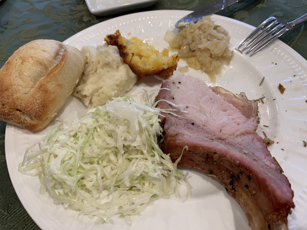 Plated with sauerkraut, slaw, roll, mashed potatoes, and pineapple soufflé.