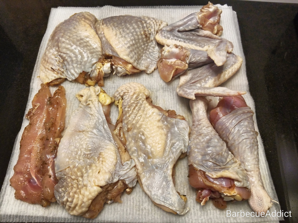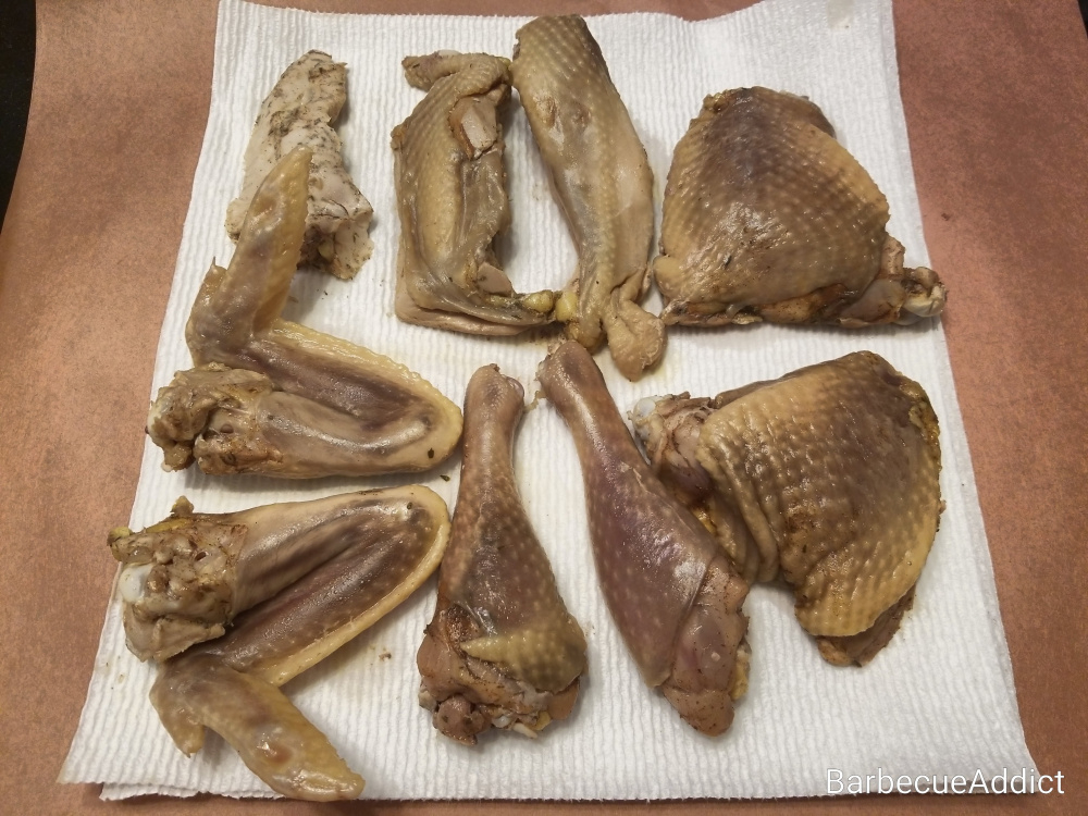 The guinea hen was sectioned, wet brined in a mixture which included McCormick's Caribbean Jerk seasoning, OakRidge BBQ Game Bird & Chicken Rub and HardCore Carnivore Amplify overnight, then rinsed and cooked sous vide at 145F for 2 hours.