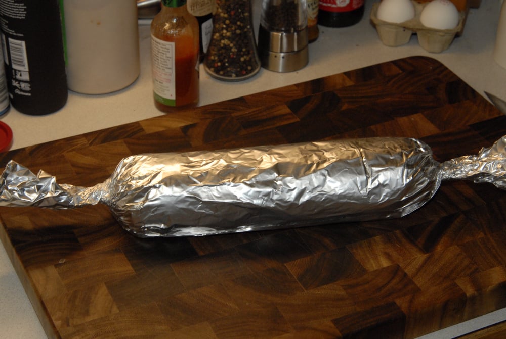 Cooked at 275 until the phallic phood reached 150. I then re-wrapped in heavy foil, twisting the ends to make it tight, and got my 2-lb Reynolds Aluminum Phattie Blunt: