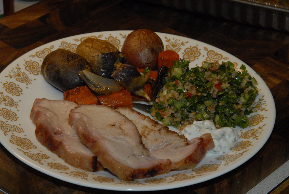 Folks, this is the best pork roast I've ever made, hand's-down, and the house smells wonderful.  The curried roasted veggies were good, and the tabbouleh (which has a lot of fresh parsley) a refreshing counterpoint to the fatty pork.  Will definitely be making this again, hopefully with a true pork loin roast sans ribs (I think a tenderloin might come up too dry) with some water added to the spice mixture, and tied this time so it doesn't go all boi-i-ing on me.  Thanks for looking!