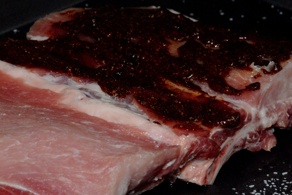 Cook involves butterflying a 3-lb pork loin roast, dry-brining for 45 minutes at room temp, spreading the inside with a mix of some unusual spices, including allspice, cinnamon, ginger and ground clove, mixed with honey.  The roast is then tied in several spots, and the remainder of the honey mixture spread on the outside.  The commissary only had two roasts in the case, and both were almost 4 lbs (unusual for this kinda roast, they're usually 3 lbs).  When I got home I figured out why, they were pork loin rib roasts, with a rack of ribs on the bottom (I double-checked the package, mine was mismarked).  I decided to go with it, and butterflied the meat above, and spread on the spice mixture: