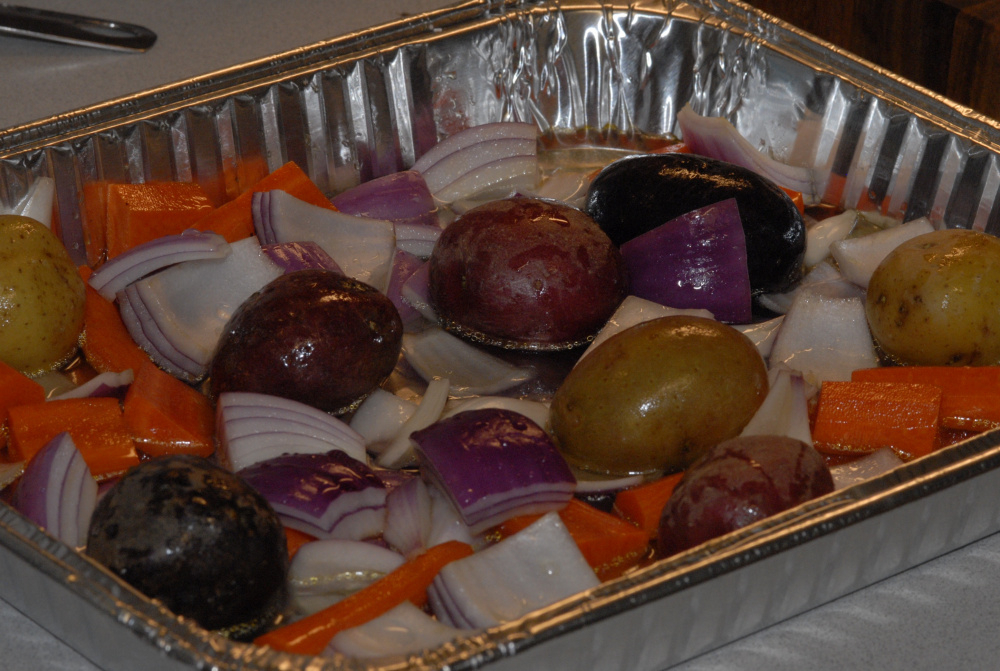 I didn't know if I should go ahead and tie the roast up, with the rib bones there; since I was out of twine (d'Oh!) I left it untied.  Prepped some baby spuds, carrots, red onion in olive oil and curry powder (I can't remember who here posted the "Curried Carrots" recipe, THANK YOU as I've made them many times and, after today, know its excellent on other veggies too):