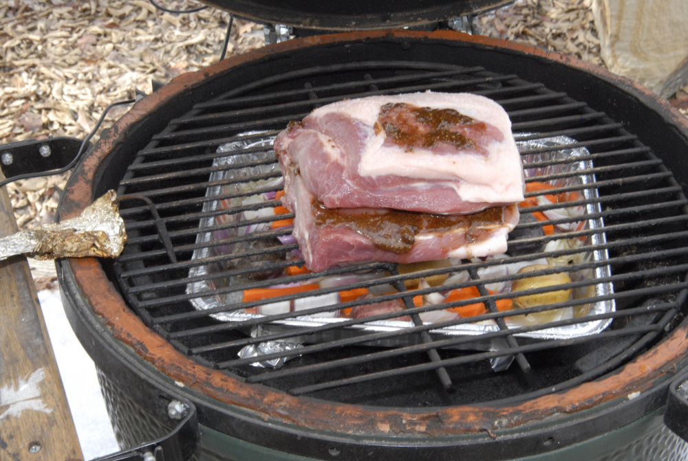After an hour I went out to check the internal temp, and the upper flap of meat had curled up!  It temped at 150º, and the bottom half with the ribs, 120º.  I pondered what to do, and decided to pull it and just eat the top portion, and finish cooking the ribs at a later time.  Per the recipe I tossed the veggies in the oil/fat, and cranked the Egg up to 450º for another 20 minutes or so.