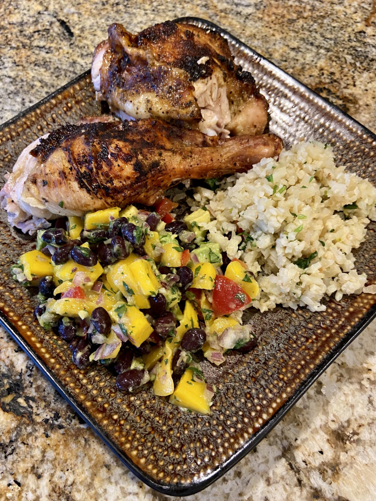 Plated up with Cilantro Lime Cauliflower Rice and Mango Black Bean Salsa