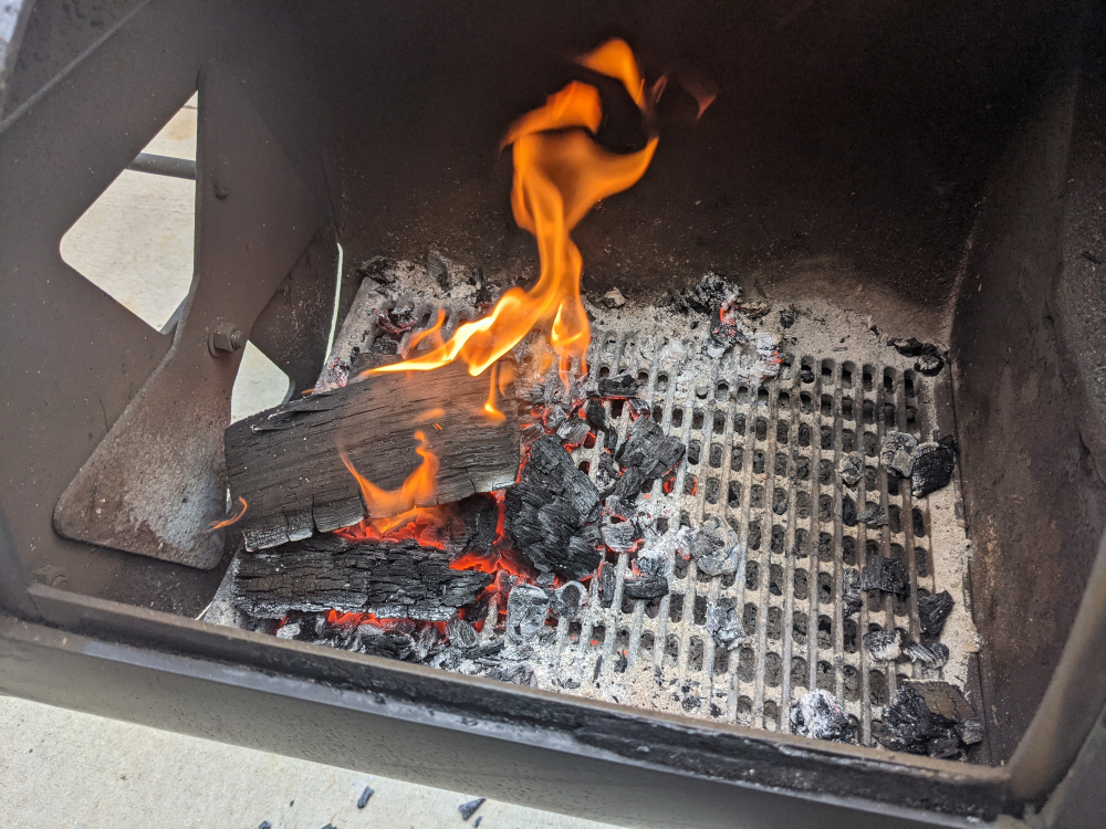 I added a bigger split because that little fire isn't going to cut it. The front thermometer is up and past 300 degrees. I might have to cut them up into chunks to see if that helps at all. Small splits appear to be way too hot for this smoker and a little baby fire isn't going to work.