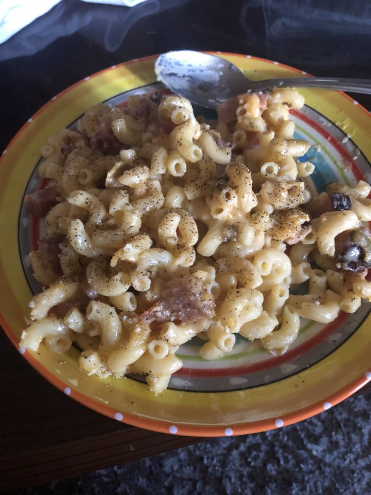 Smoked ham a few months ago, stumbled upon leftovers in the freezer. Thawed and diced. Used 1lb normal Barilla elbow macaroni. Used some of my annual stash of local roasted green chiles, didn’t measure, but should have added more.