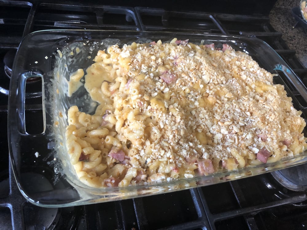 Crumbled up some butter crackers for a toasted topping, but we couldn’t wait long enough for it to get very toasty. Baked at 400 for about 15min, before we caved in and feasted. Could have finished on the BGE, but didn’t feel like messing with it. This was an incredible, smoky, delicious treat!