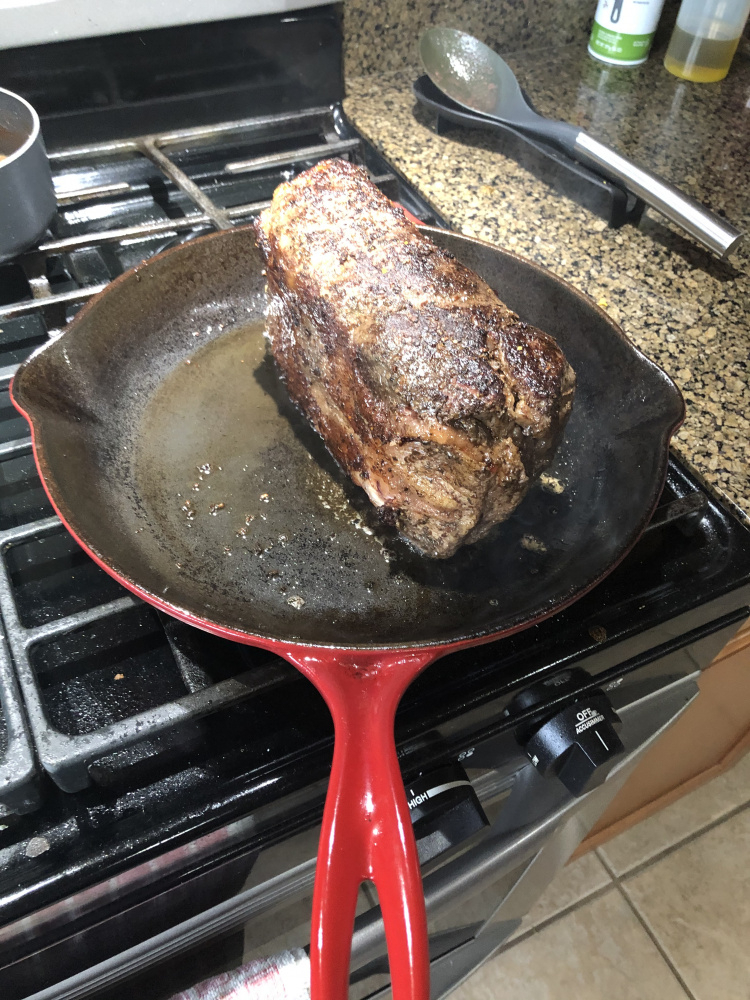original plan was to sear on the LBGE, but a storm rolled in so I seared in cast iron.