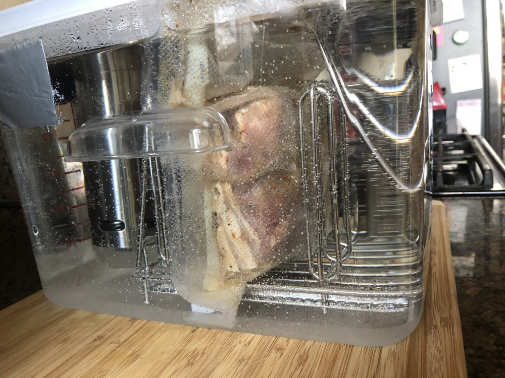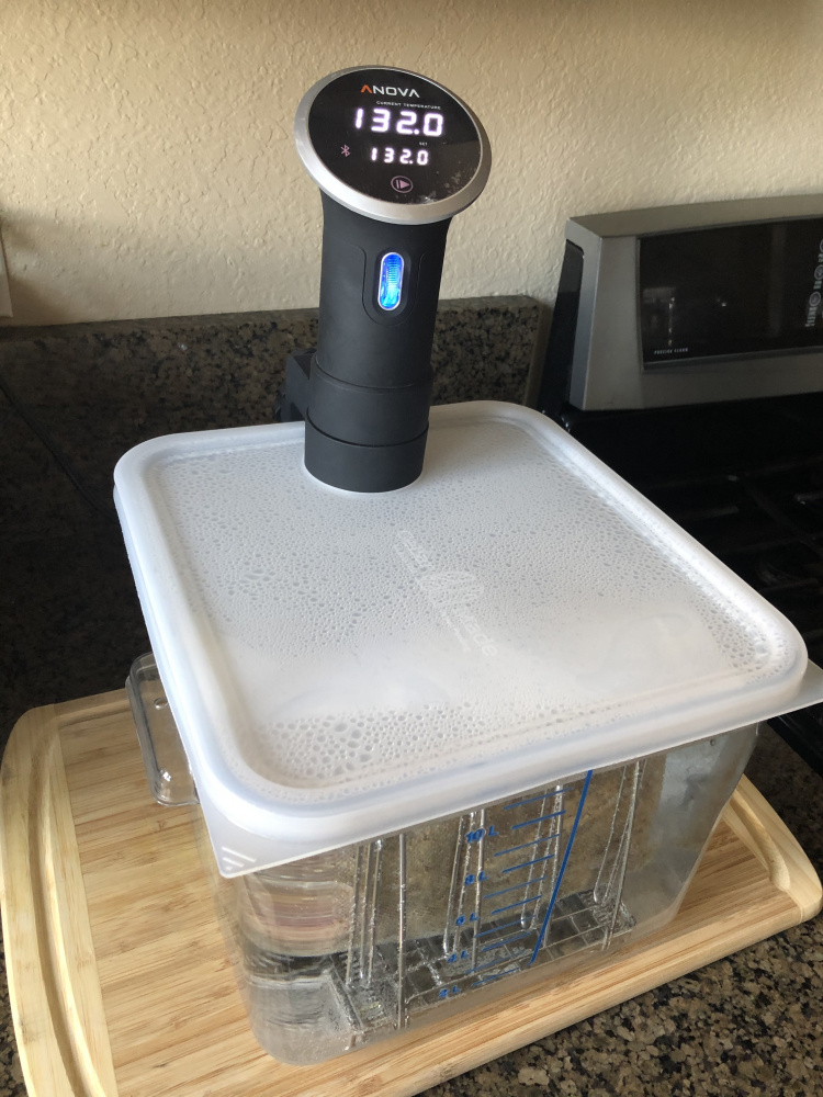 ~3.5 lb chunk of choice NY strip, in sous vide for 9 hours at 132F.