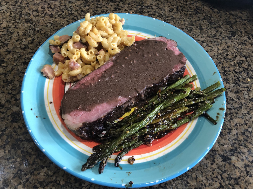 Seared, sliced , and plated. Planned for a BGE sear here, but the weather didn’t cooperate. Served with green chile mac-n-cheese (leftover from other post) and a slice of garlic bread (toast, not pictured). Beef was great, nearly fork tender even sliced this thick, and delicious. Sauce was very good.