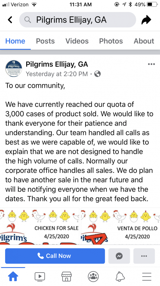 Pilgrims Pride chicken sale Ellajay,Ga 4/25/20