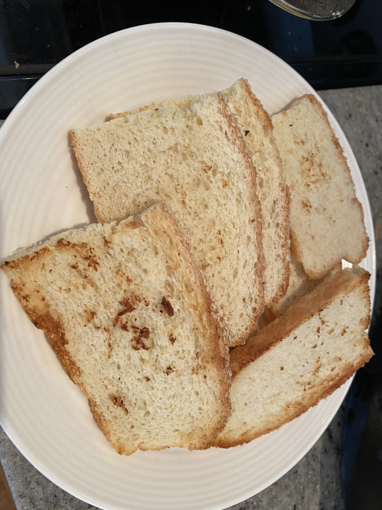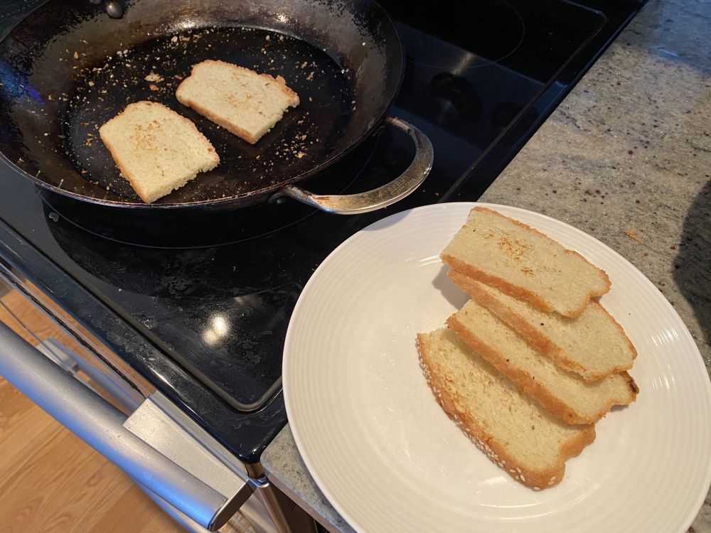 Once the veg has gotten some colour on it, I added it to the other ingredients in the blender (Vitamix) and gave it a six minute whirl. I used the blending time to cut up and grill some homemade bread, which was then served with Monterrey jack and old cheddar.
