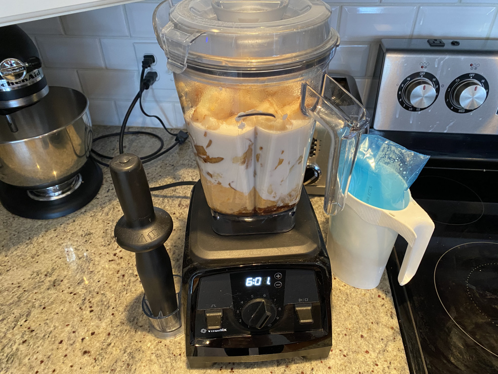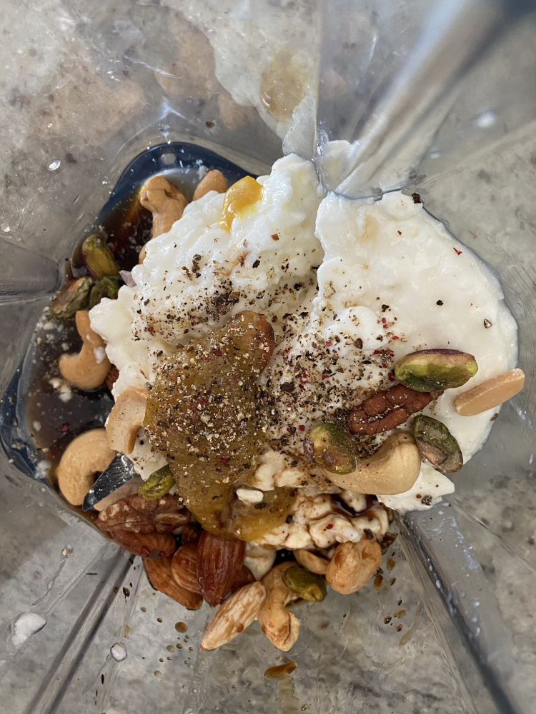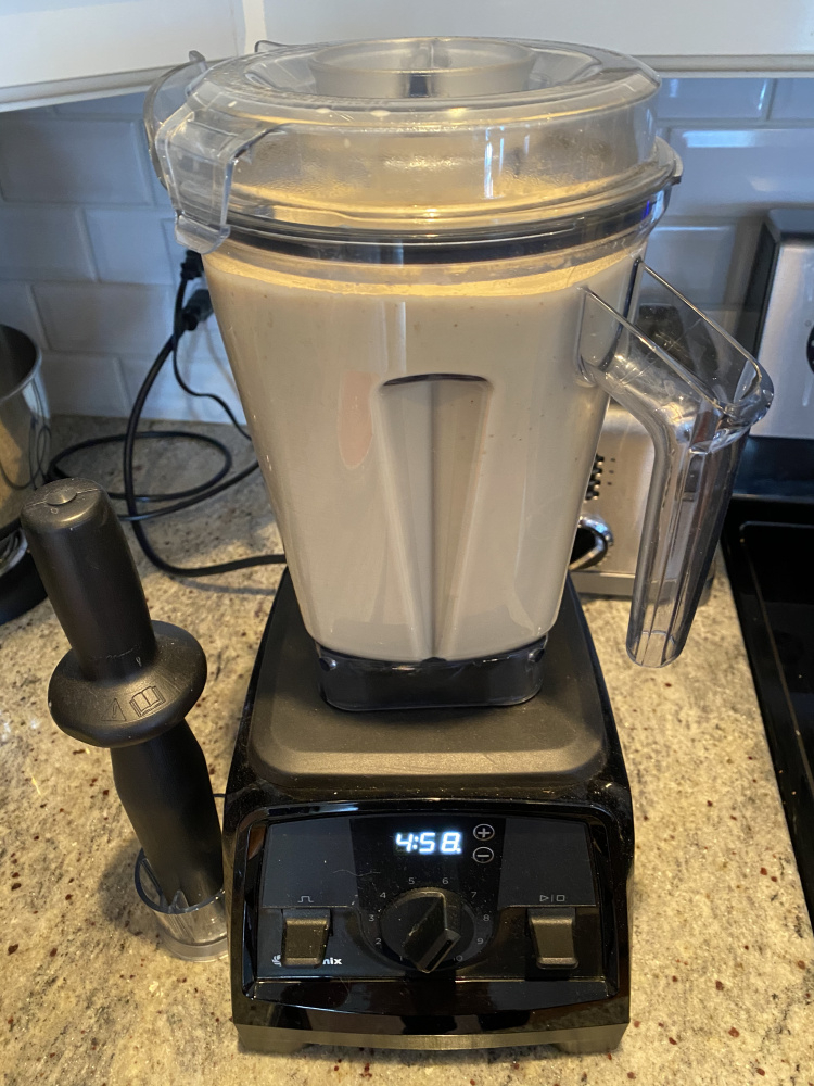 While the above is cooking, I usually throw about a half tub of cottage cheese (for creaminess and protein content), bouillon, some sort of acid (today, it was balsamic vinegar), milk, some pepper and, just for some fattiness, toasted nuts, into the blender. Given that I had a healthy portion of leftover mashed potatoes in the fridge, I also threw them in for good measure.