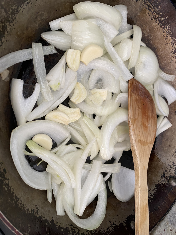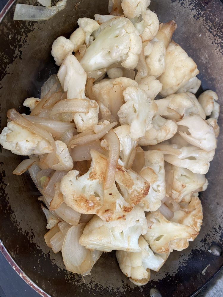 I start by frying or roasting aromatics for the soup - usually sweet onions and garlic. I then add whatever veg forms the basis of the soup into the pan - cauliflower for tonight.