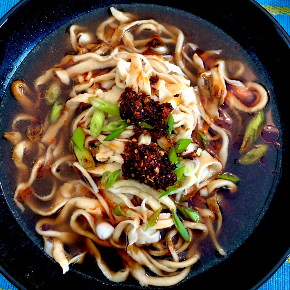 . The recipe is straightforward enough, but I could only pull them to the 4 strand stage, then they would break. So I sort of stretched each one individually from there. Didn’t take as long as it sounds. The dough was definitely more stretchy and plastic than my previous attempts with lye water in the dough. Pulled out some of the lamian broth I had from the first attempt. Boiled the noodles. Plated (bowled?) with broth, dark soy, chinkiang vinegar, and a good shot of homemade chili oil.