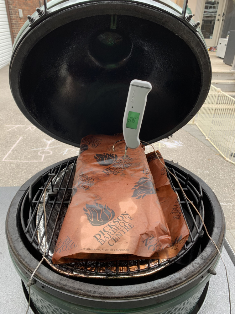 smoked it until it reached 165 internal wrapped in butcher paper and placed in back on the egg until it hit between 205-210 internal.