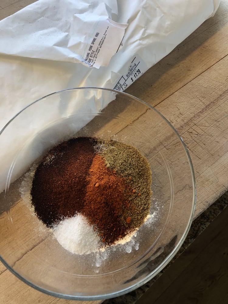 4 TBS brown sugar, 2 TBS paprika (smoked if you have it), 1 TBS garlic powder, 1 TBS onion powder, 1 TBS chili powder, 2 tsp ground cumin, 1 tsp sea salt, 1 tsp cayenne.