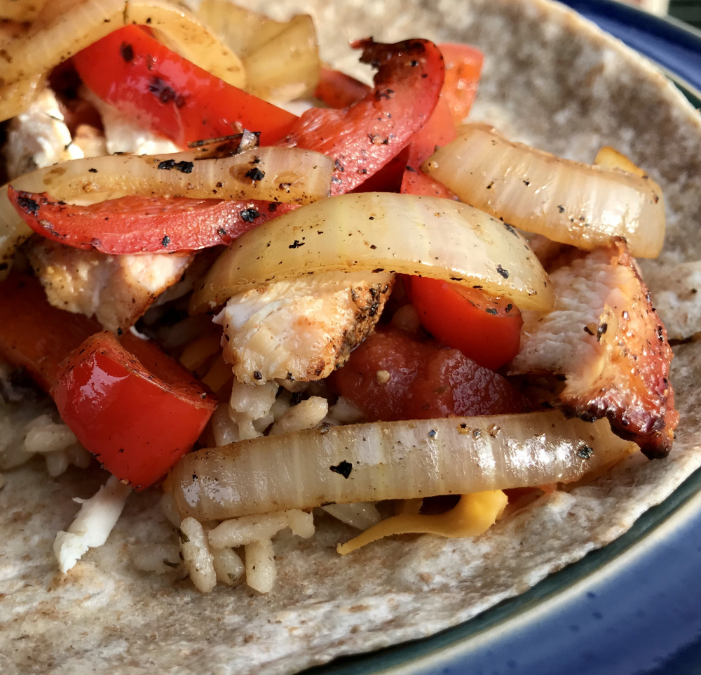 Chicken Fajitas, sautéed onions and bell peppers, grilled chicken breast with dizzy dust, rice, salsa, cheddar cheese in a whole wheat tortilla