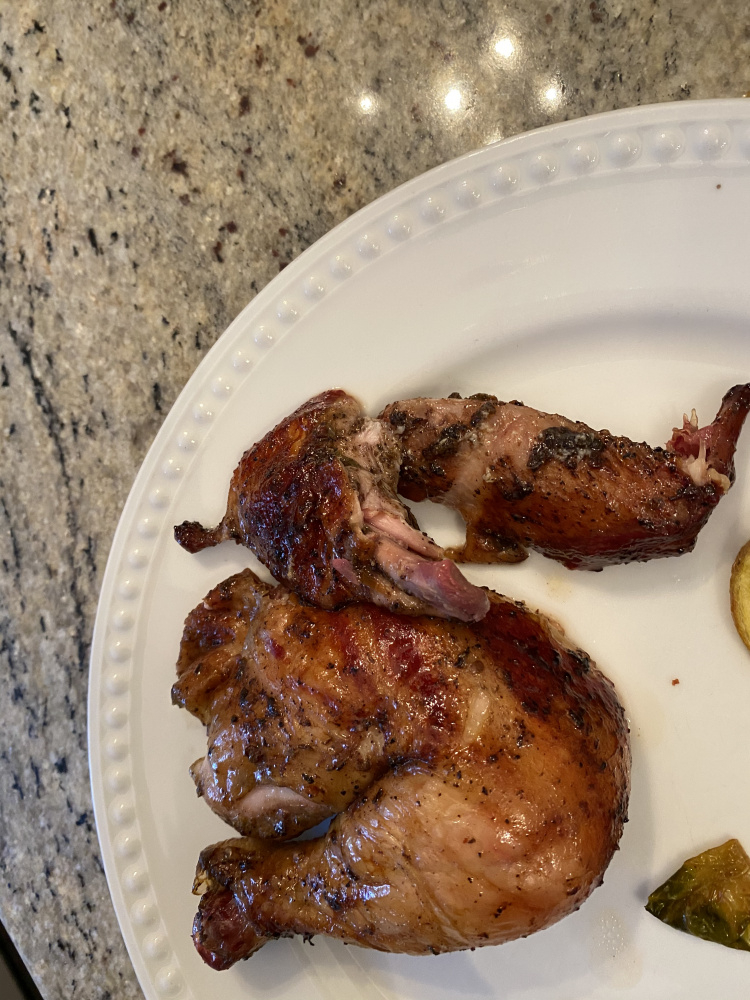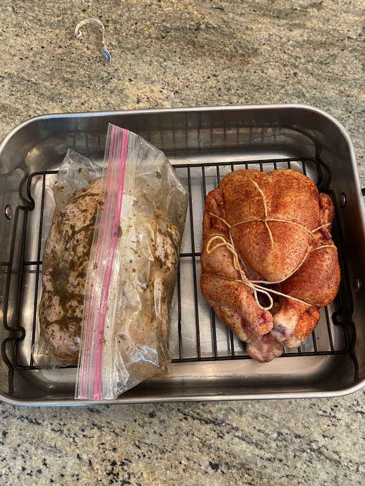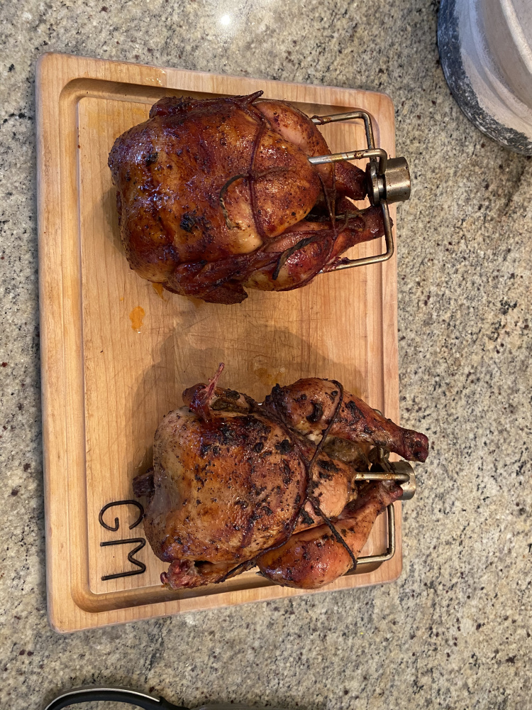 The joetisserie has become my favorite accessory. I had my best results yet this past weekend. One chicken with meatchurch gospel, the other with walkerswood jerk paste. I went with a lower temp (320-340) and peach chips and apple chunks.