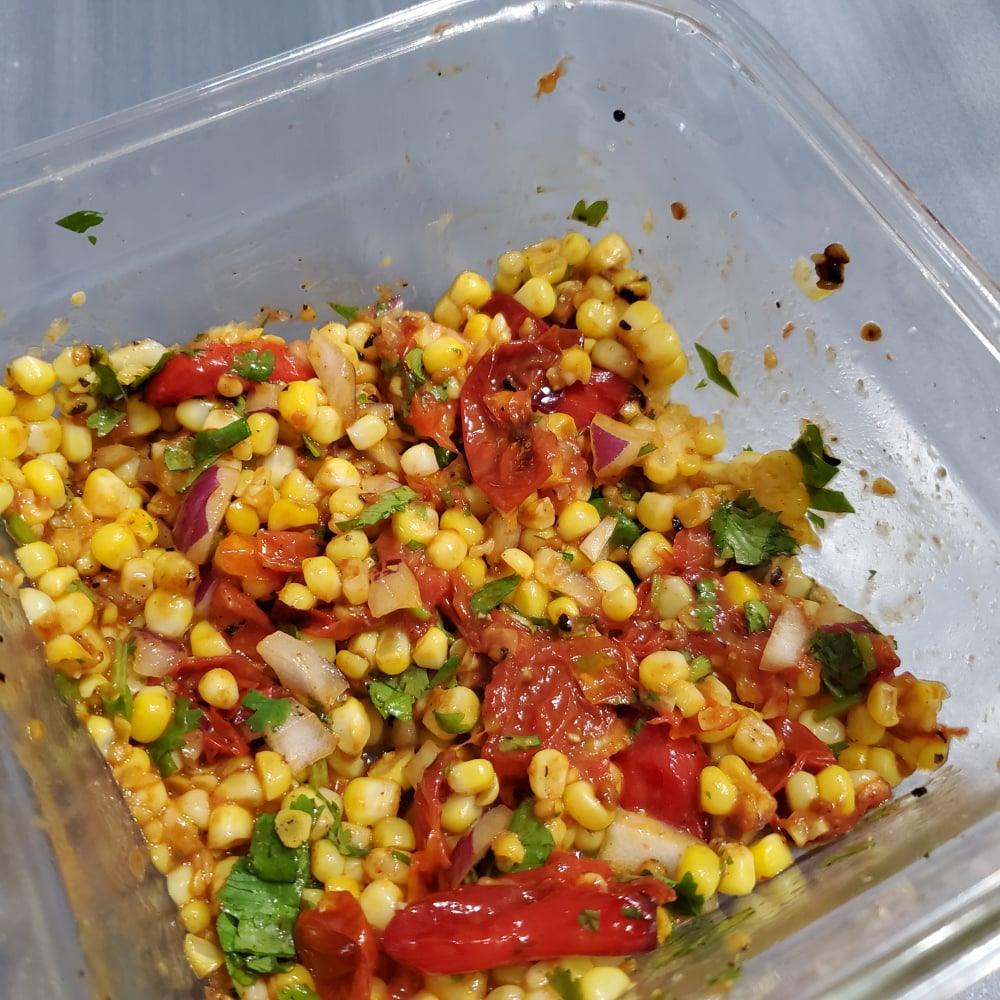 Corn, roast tomatoes, roast serranos, onion, cilantro.