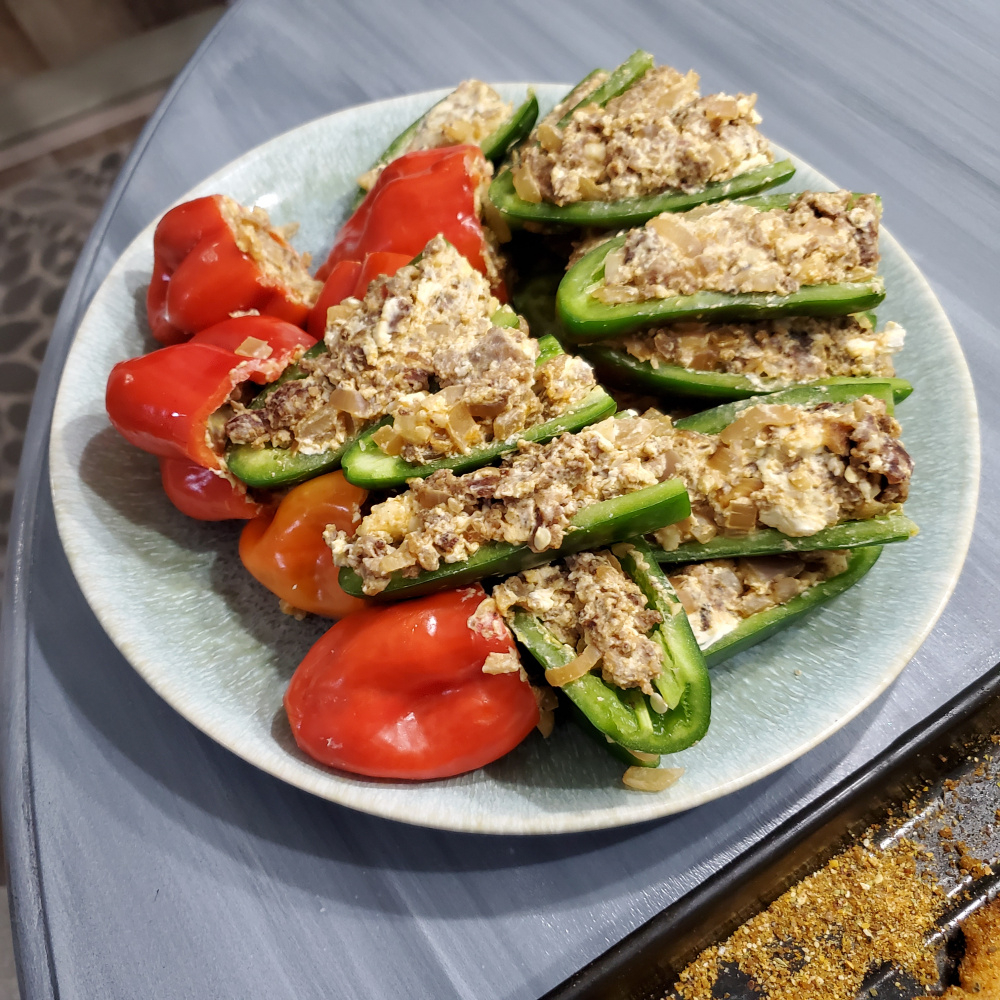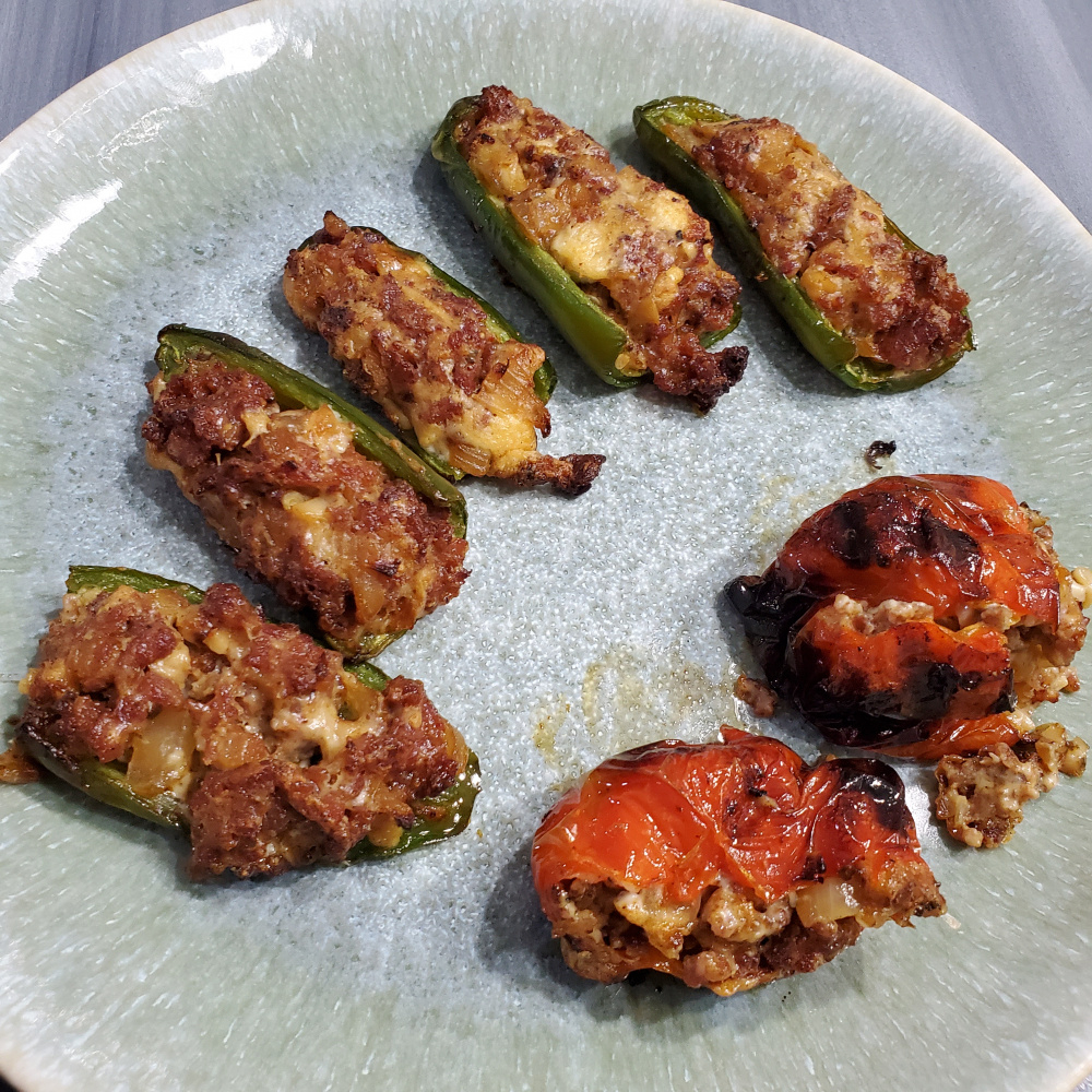 Stuffed habeneros, and jalapeños (sausage, cream cheese, blue cheese, onion, garlic)