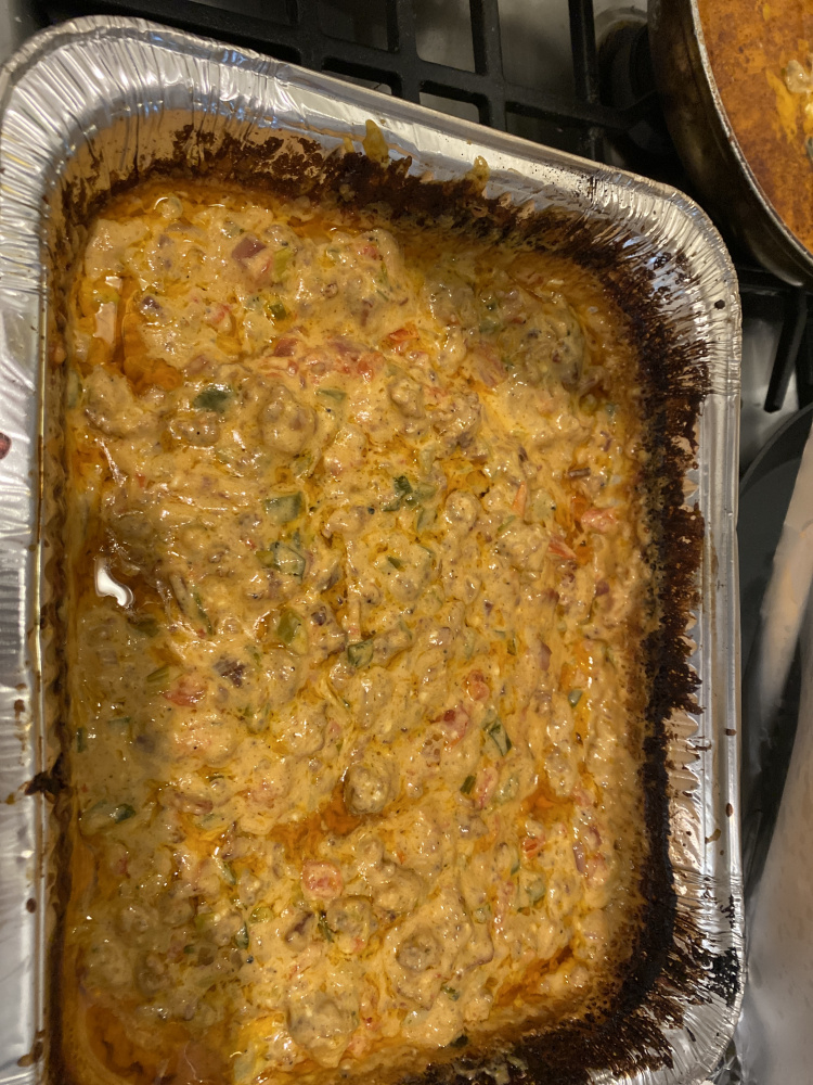 Mixed all together and topped with dizzy pig fajiataish.  A few wood chunks on the egg, rock wood charcoal, at about 350 for 60-90 minutes till all melting and able to be mixed a suitable for a dip.