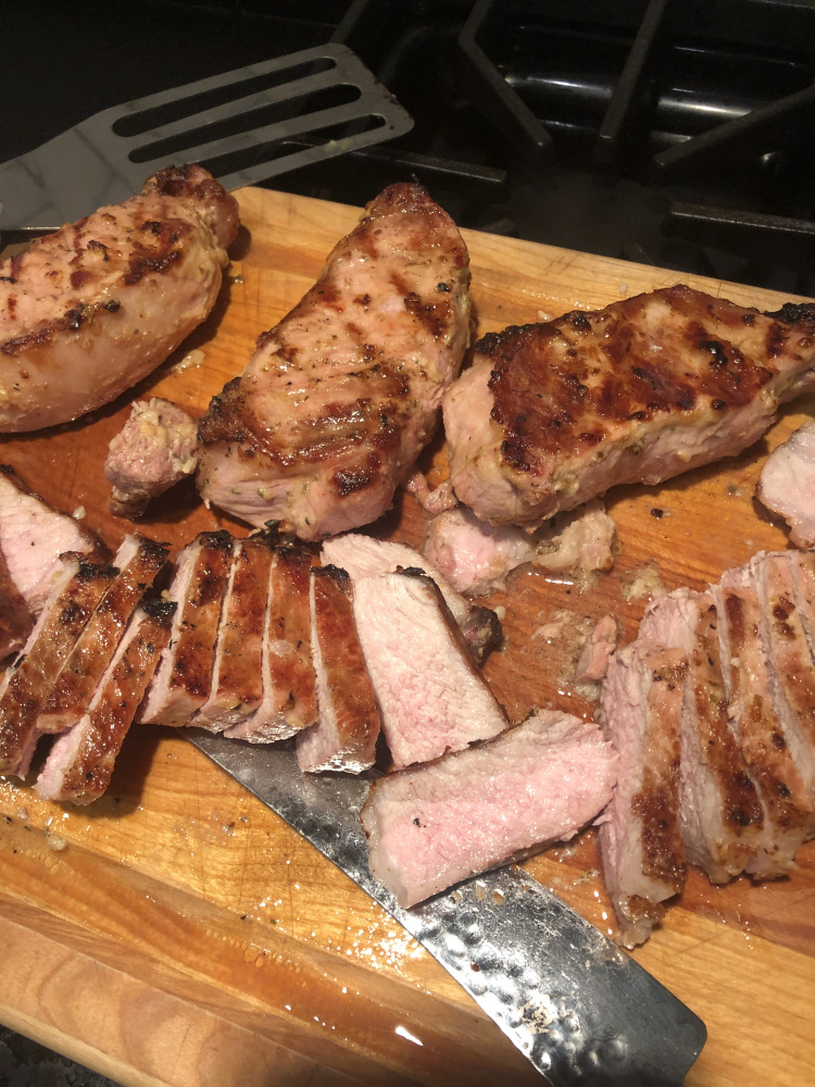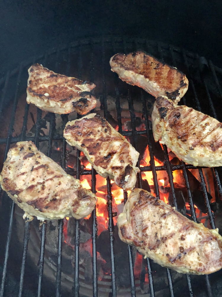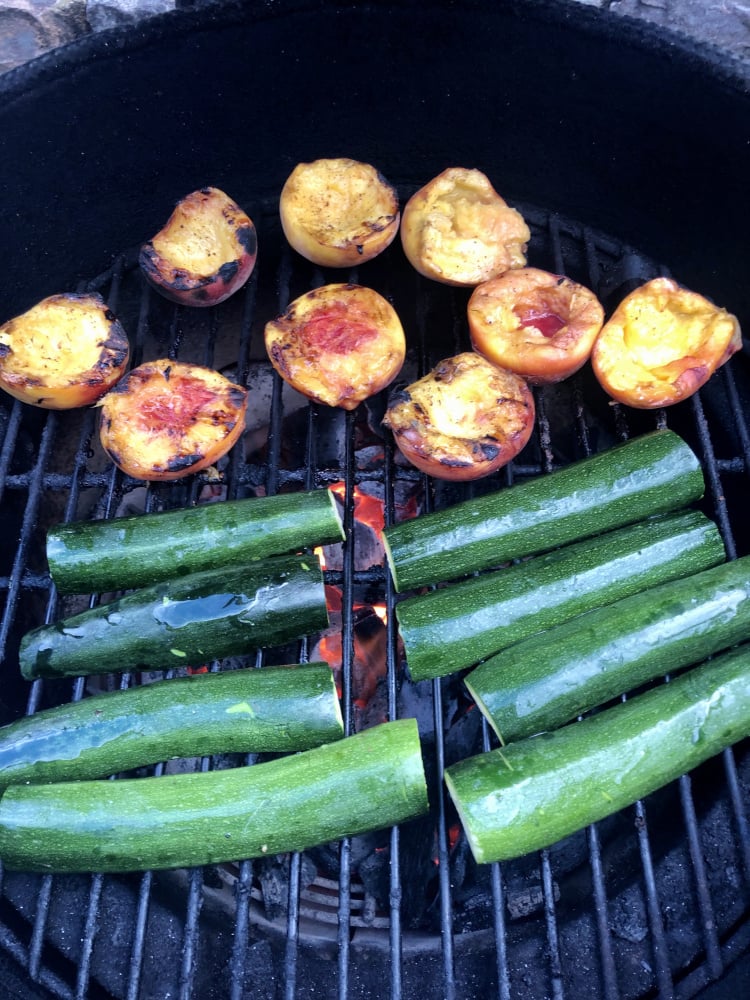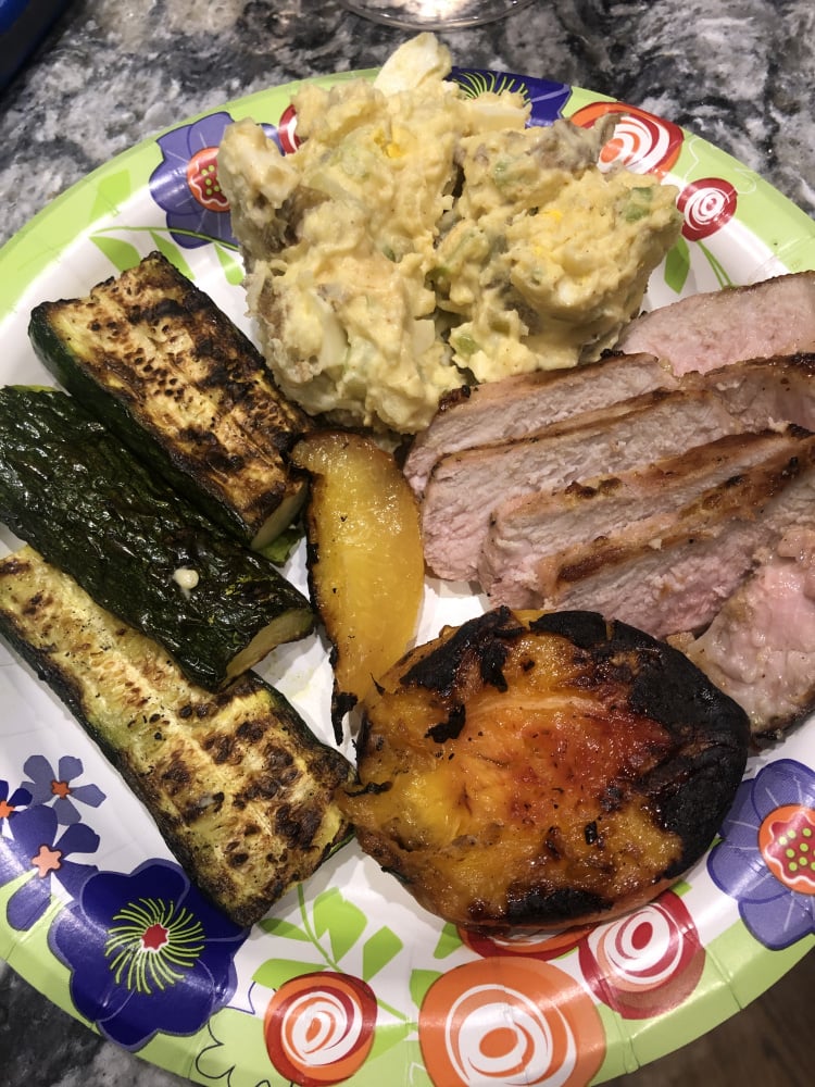 Tonight:  boneless poke chops, grilled zucchini, grilled peaches . . . and potato salad.