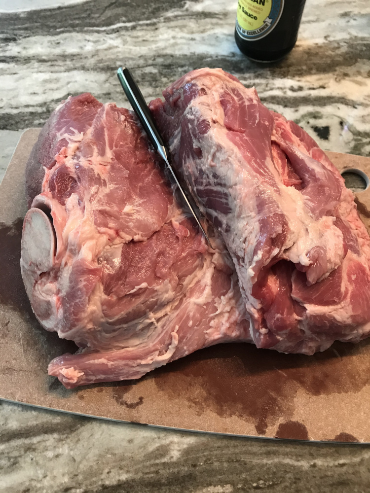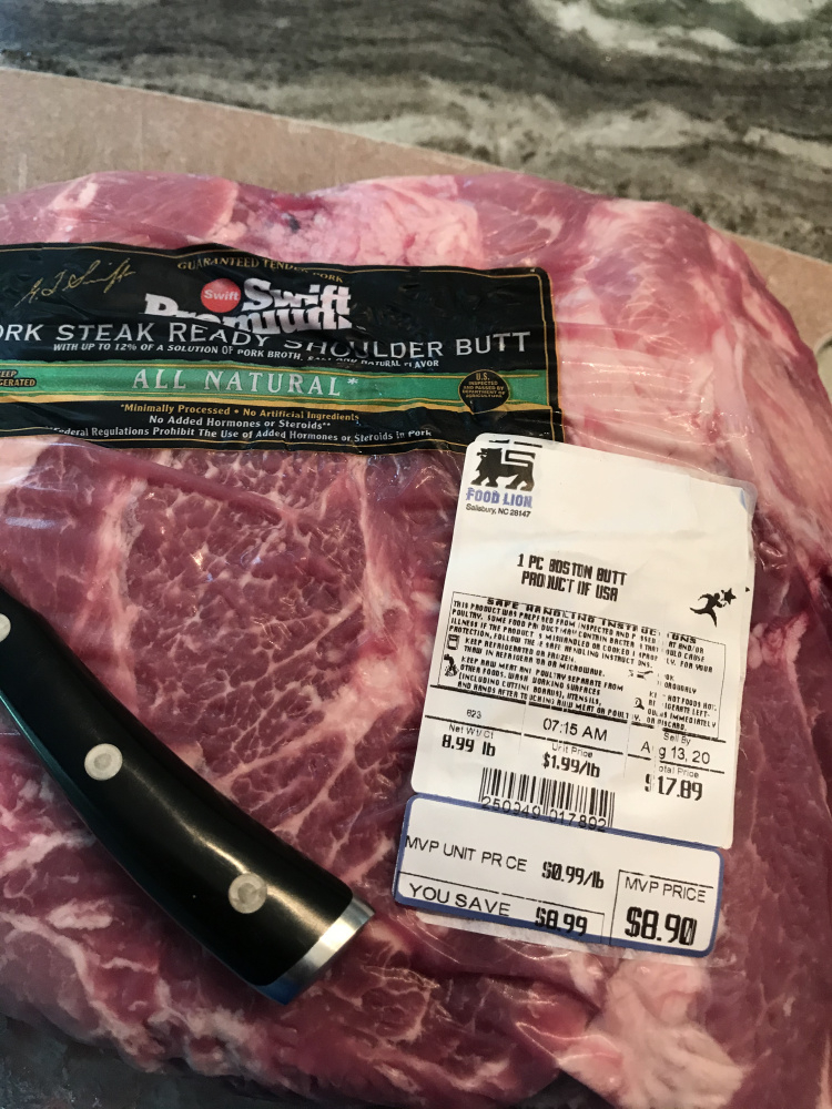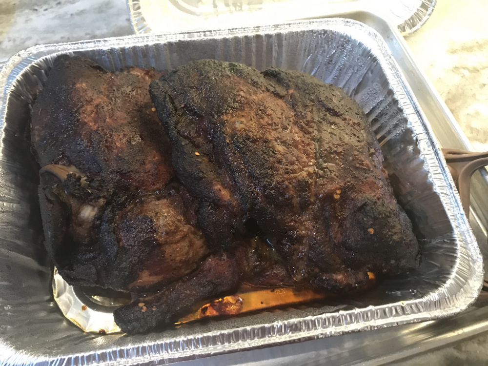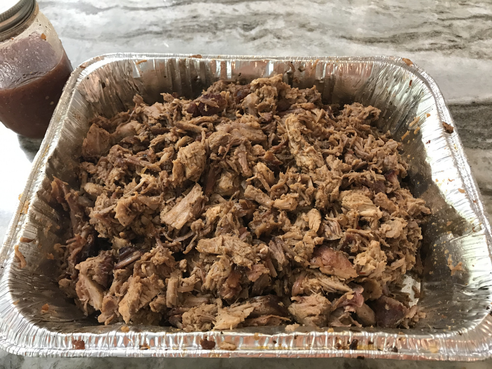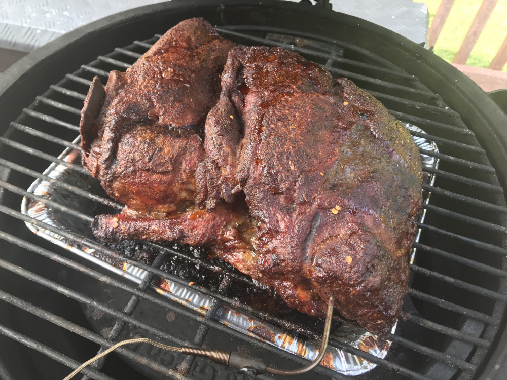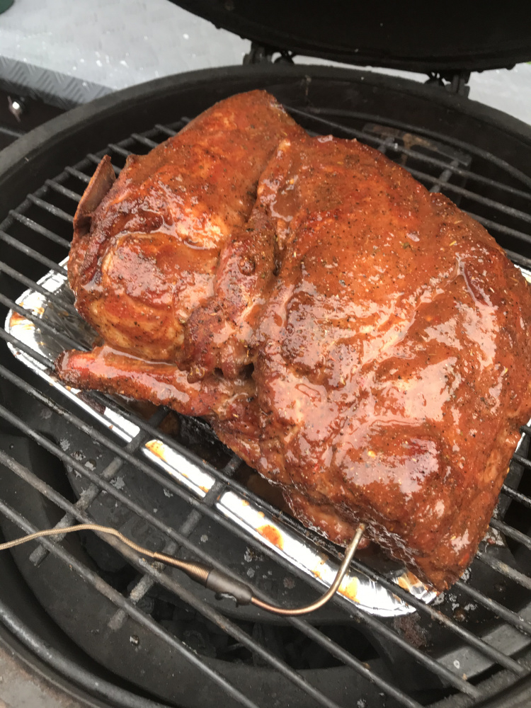 I used a Lexington style sauce to mop it three times every, but stoped mopping because I wasn’t happy with how the bark was forming. After the third mop, I didn’t open the Egg until it hit 170*. I was in the stall at 160* foot a good 1 1/2 hours. I panned it at 170* to catch the drippings.