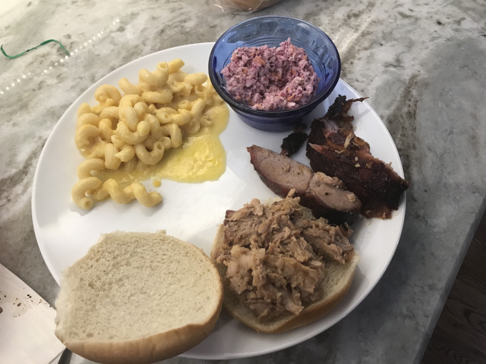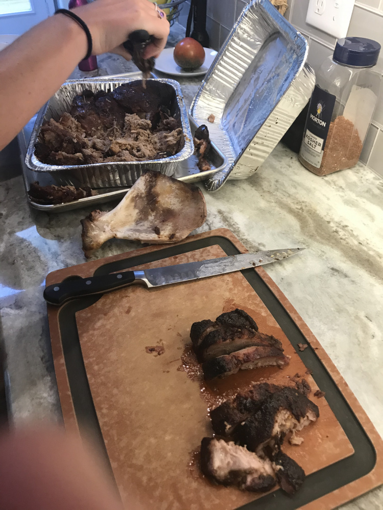 It probed like butter in 3 of the 5 places I checked so I pulled it for 30 minutes rest. It ran for 12 hours but it could have went a little longer. Was kind of a tough pull. I sliced the money muscle, shredded the middle section, and chunked the end by the bone.