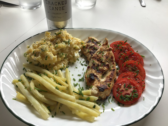 Served with potato salad (from left over mash potatoes), yellow beans, and tomatoes.