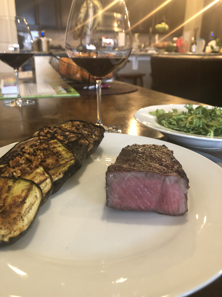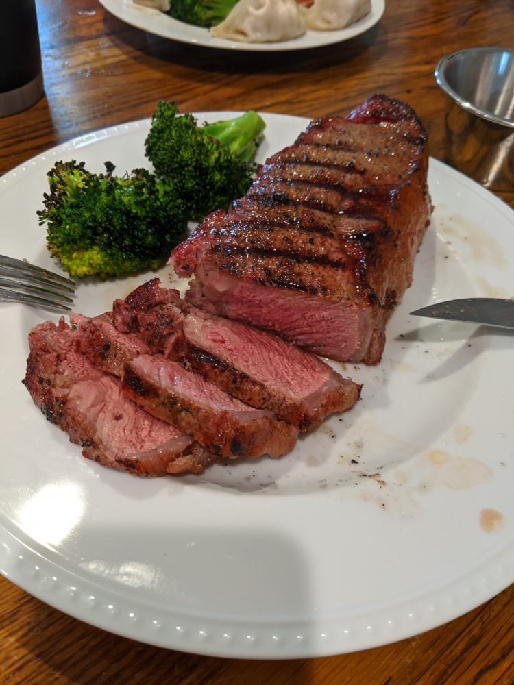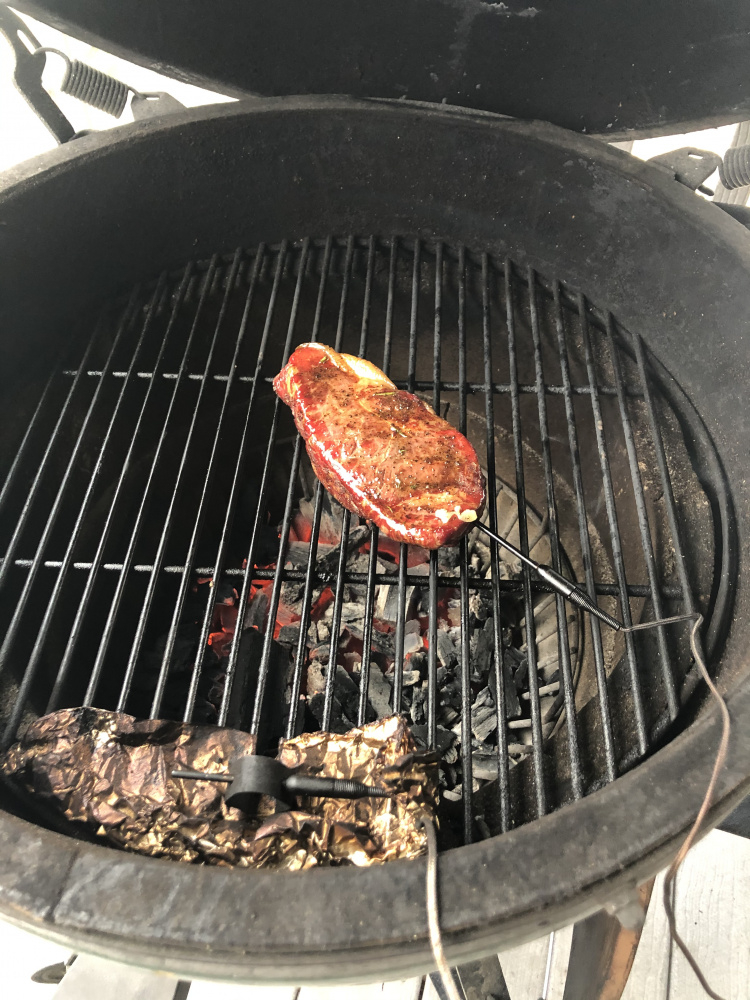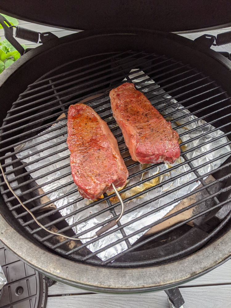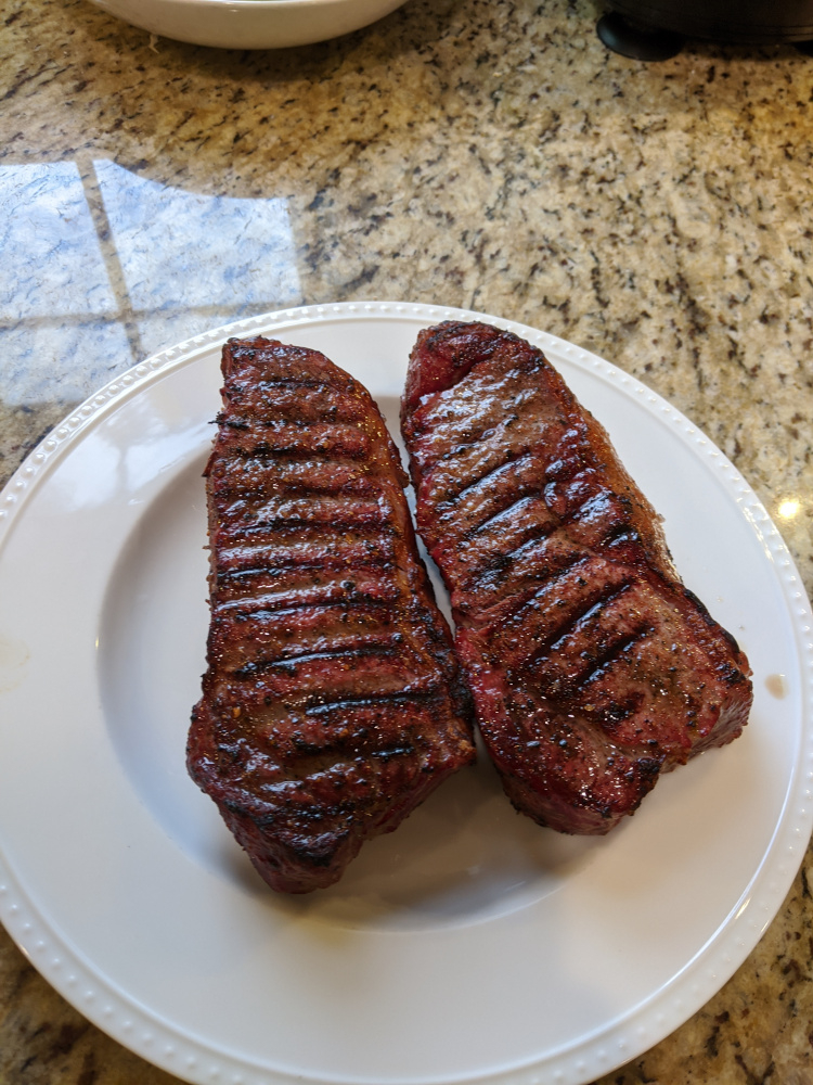 One thing I love about this hobby is the infinite variability. I don’t mean to hijack the thread, but had a very similar cook. I used a 30 day dry aged ny from Whole Foods instead of Costco. Smoked at 225 with hickory chunk to 120. Then grilled some eggplant rounds on grate while I waited for it to get up to 500. Simmered some tallow with thinly sliced garlic and fresh rosemary for 15 minutes, then strained. Brushed both sides of steak with the tallow and onto grill, flipping every minutes to 131 internal. So much fun to play with 120 vs 125, dry aged vs prime, etc.