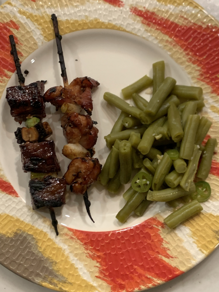 Chicken thigh yakitori and wagyu ribeye cap yakiniku with green onion and mushrooms. Served with canned green beans, cuz they are great.
