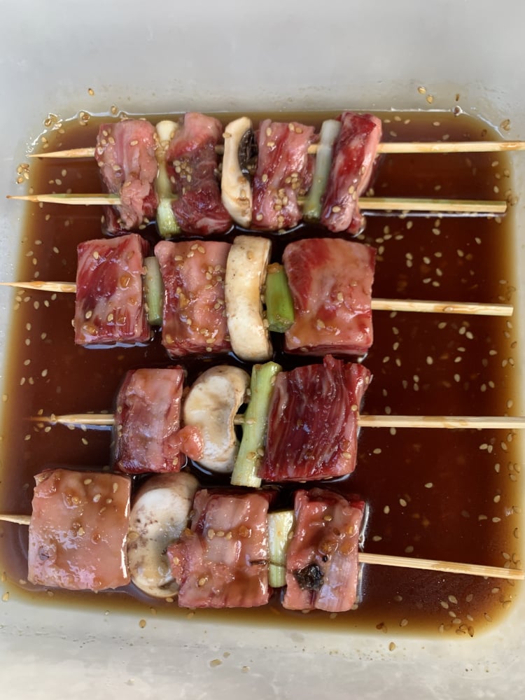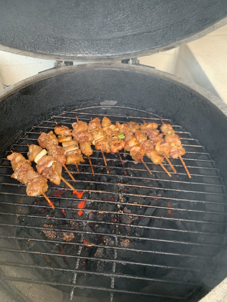 I meant to make these on my little konro grill, but it was too hot and I egged the skewers. Still very good, burnt the overhanging bamboo.