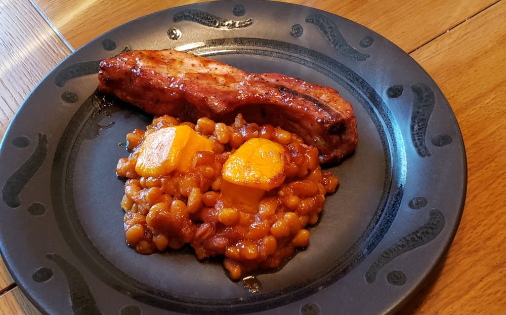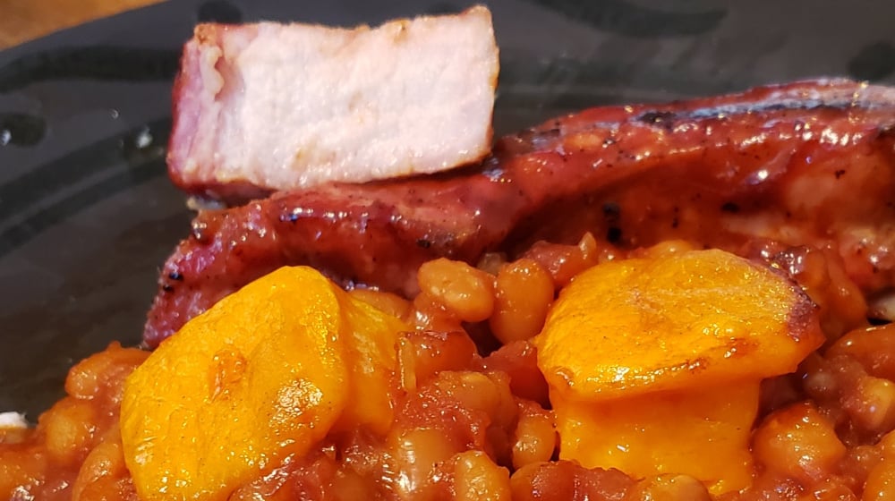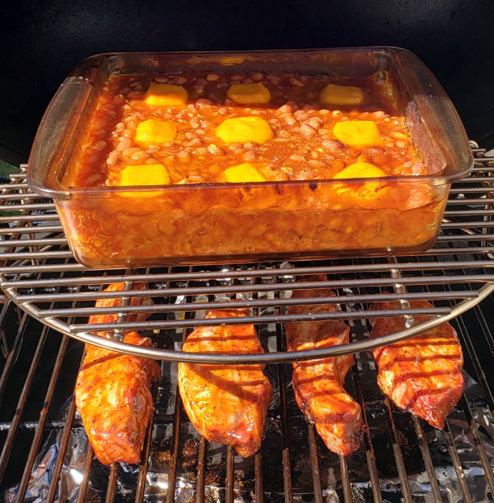Made a quick dinner of country style ribs, sliced pork butt, and grilled beans and cheddar
