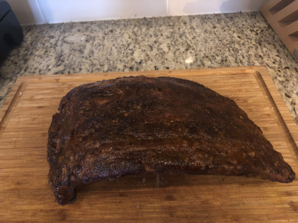 Got ahold of some mangalitsa St. Louis ribs I’m planning to make for wife’s birthday on Saturday. They are huge, so decided to carve off 4 for a dry run. I do the amazing ribs sous vide and smoke method. First problem, they were too big for my sous vide bags. Solved with trip to cabellas. Second issue, too big for my 12 qt sous vide container. Used a large pickling pot covered with foil. Third challenge: they are so curved it was hard to use the “bend test” for doneness. I just guessed. I coated with thin layer of avocado mayo, applied butt rub and sealed. Sous vide 24 hours at 150. Onto smoker at 225 with 2 applewood chunks for 30 minutes. Brushed with a mix of nandos extra hot, butter and erythritol. Smoked another 15 until the sauce started to crust, then served. Overall quite good, but will probably add 6 hours to sous vide next time. Still some collagen towards the fatty portion. And I need bigger plates, I guess. Comments