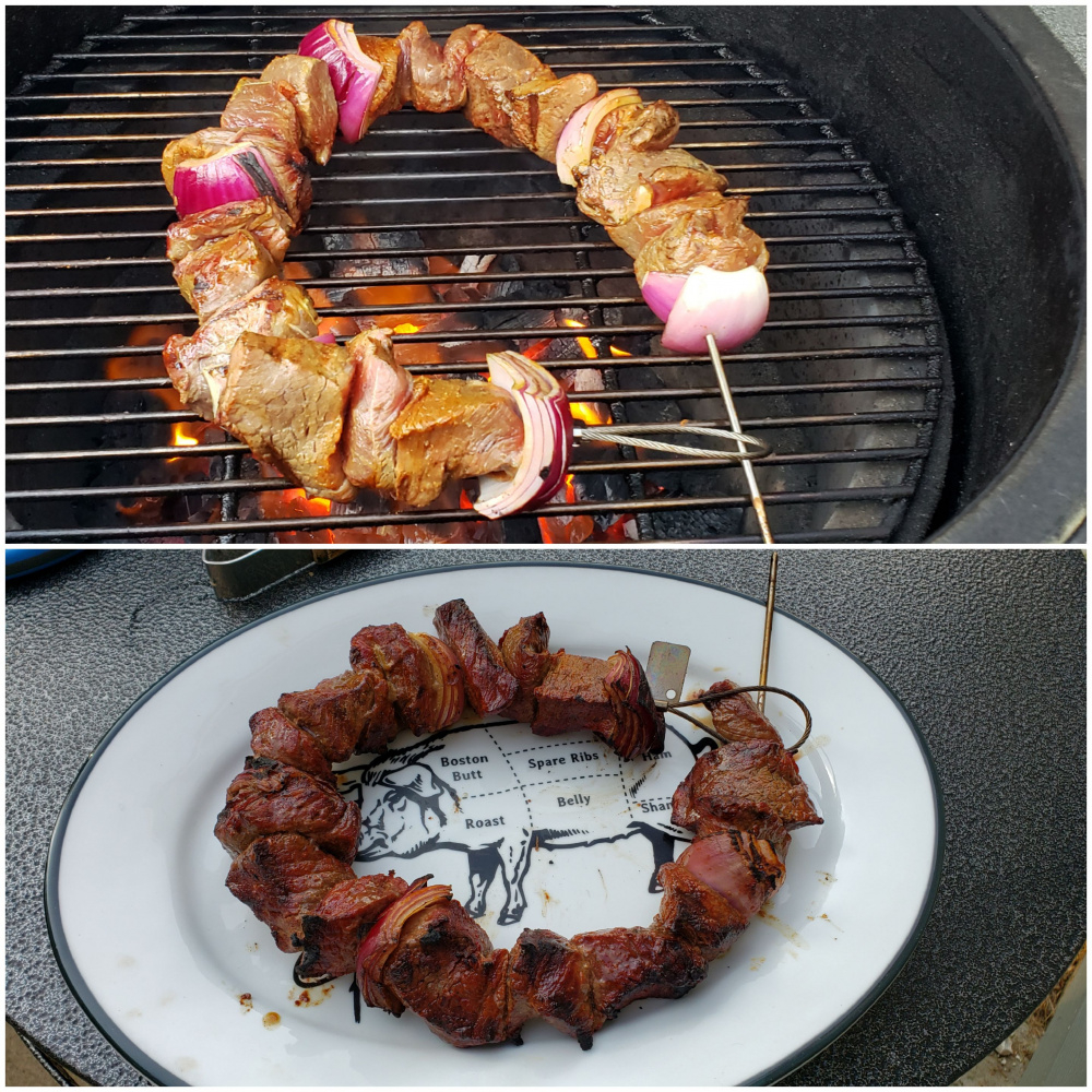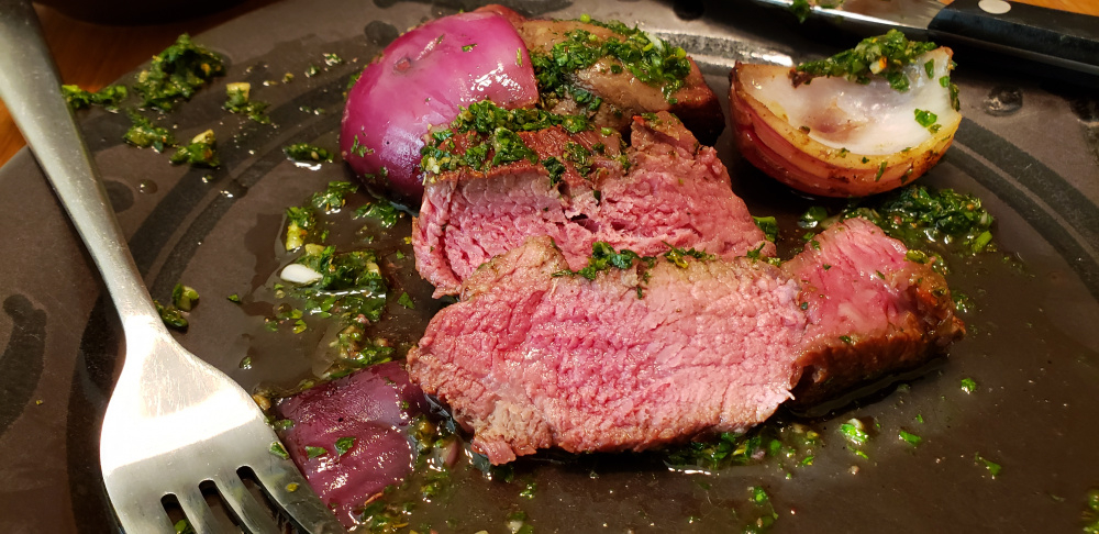 Simple sauce using parsley, oregano,  onion, red pepper flakesolive, olive oil and red wine vinegar. Grilled a sirloin kabob to put it on. Sorry about the plated picture. I dug in before photographing it.