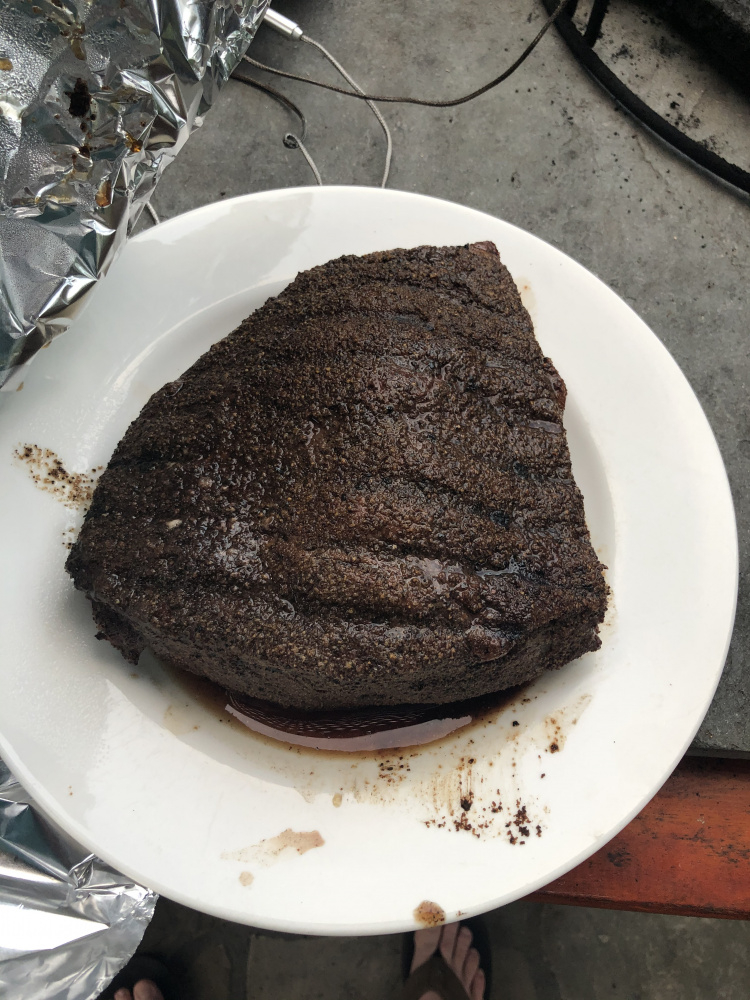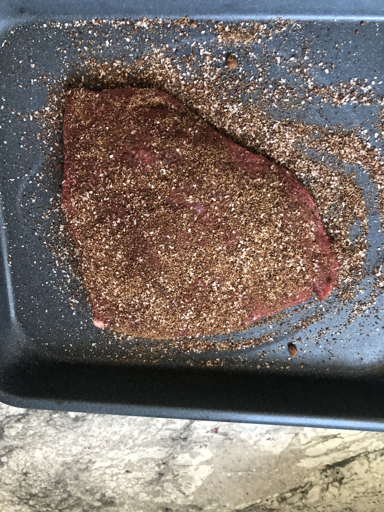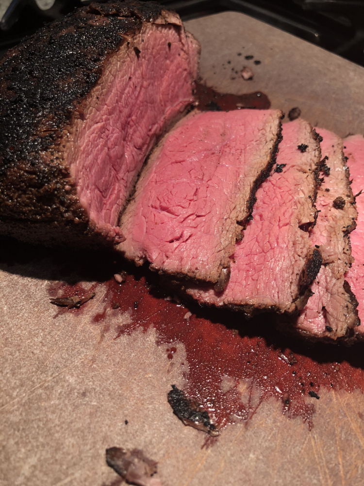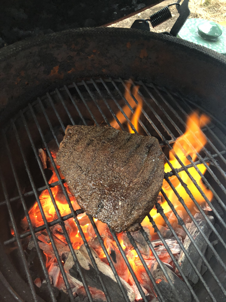 Went to the local butcher and had a 2lb tri tip cut for me on the spot. Sprinkled with my go to tri tip dry rub. It is coffee based with salt , pepper , garlic , sugar , and even a touch of ground cloves and cinnamon (recipe to follow). I know it sounds iffy but trust me. I only use it with this and it is delicious! Heated the egg to 250 and brought the meat (indirect) to 130 with post oak . Let the meat rest while creating a direct lava fire and then seared 2 minutes per side . The results , as per the last 50 times, were outstanding . Give it a try! Sorry about the order of photos. Definitely a weakness of this forum. Never been able to put photos in a specific order on here . Always jumbles them up.