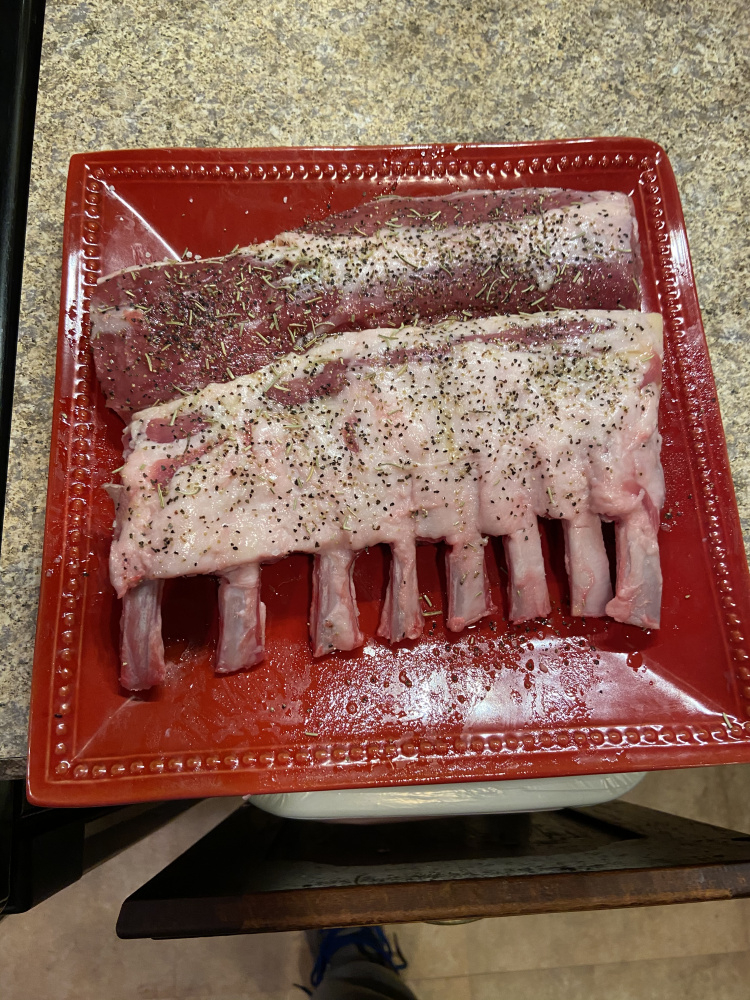1 Marinate lamb in rub: Rub rib rack(s) all over with mixture of rosemary, thyme, and garlic. Sprinkle with freshly ground black pepper. Place in a thick plastic bag with olive oil.