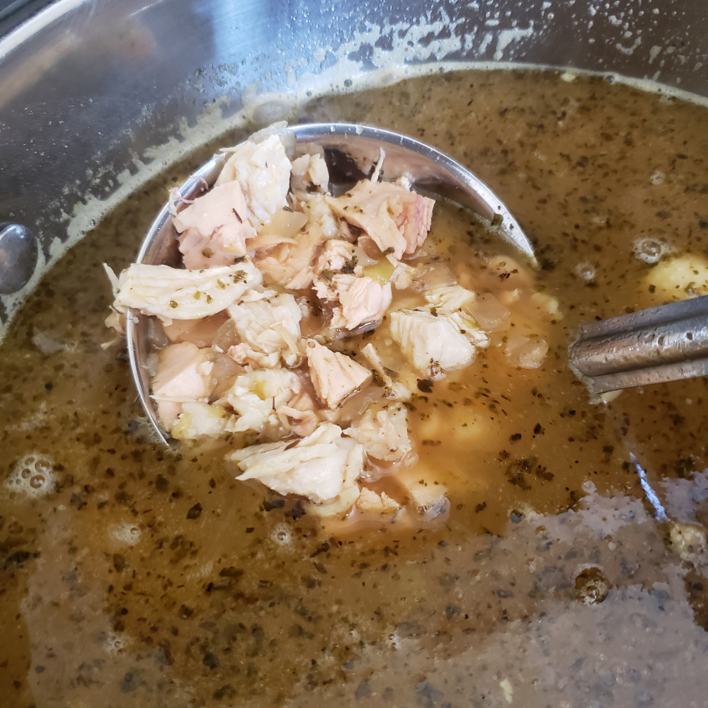 After the two hours, add the chicken, bring to a boil for about 3 minutes, then lower temp to simmer for about 10 minutes. Salt and pepper to taste.