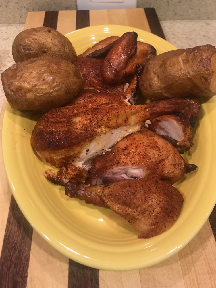 Tonight I made my favorite spatchcock chicken yet. I've even got the carving down mostly right. Here's a look.
