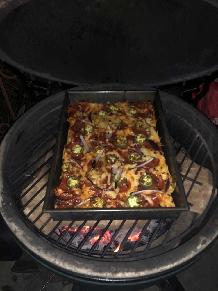 This is becoming my favorite pizza. Made the dough a few hours before using this video (https://youtu.be/ijHutbC2JnE )as a guide. 500 degrees, indirect legs down for like 20-25 mins. The crust is unreal.
