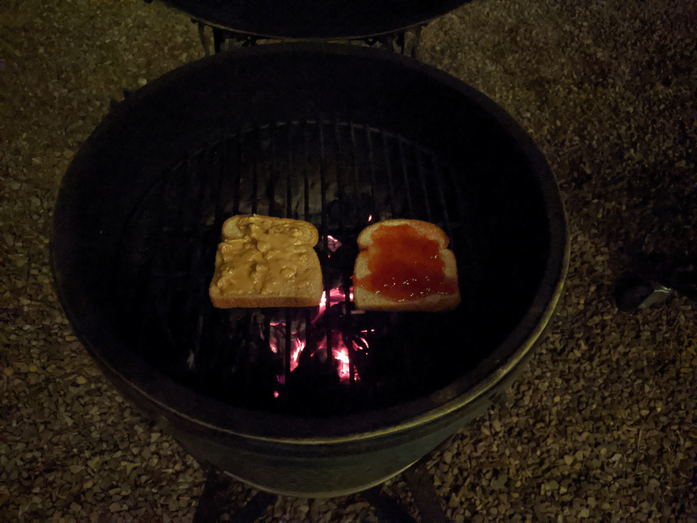 Needs some fine tuning. I removed the Woo and went on top of the fire ring instead of felt level. I wanted a decent toast, but not dried and burned. Next time I will go at the felt level. It toasted too fast to heat the peanut butter and jam all the way through, like I prefer. Instead of a warm ooey gooey mess, it was just lukewarm PB&J on toast. I think felt level and around 350 would be perfect. Maybe even higher in the dome and a quick sear at the end.JohnInCarolina said:PB&J on the Egg. That’s a first for me!