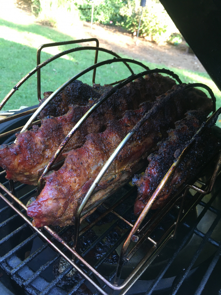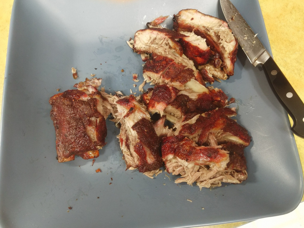 From last night, Duroc BB's with spicy Dizzy Dust. Ended up fall-off the bone so should have pulled them sooner, still came out tasty.