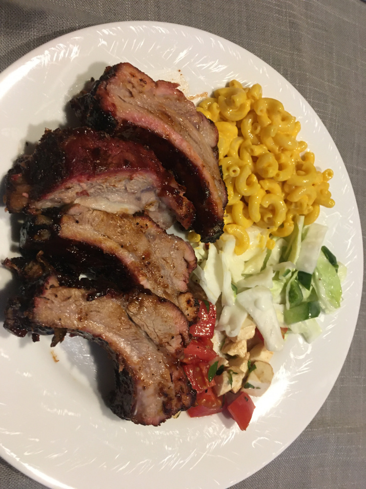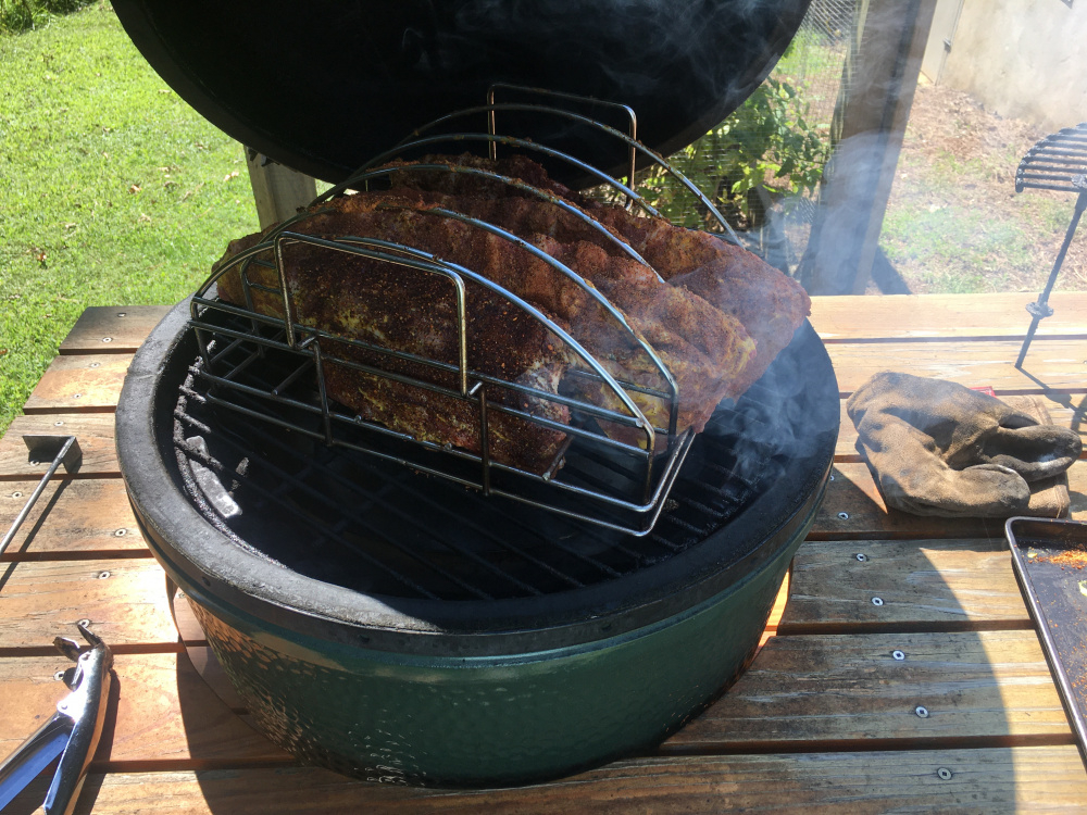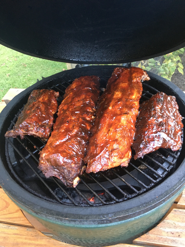 Ribs - Car Wash Mike method. Added apple chunks and chips to the lump. 2 are Prudhomme’s BBQ magic rub and 1 (halved) is Trader Joe’s coffee rub. Misted with cider vinegar and juice 50/50. Sweet baby ray’s brushed on. Dinner with Mac cheese, caprese salad, jalapeño cole slaw. Great day today! Let’s hit $5k.