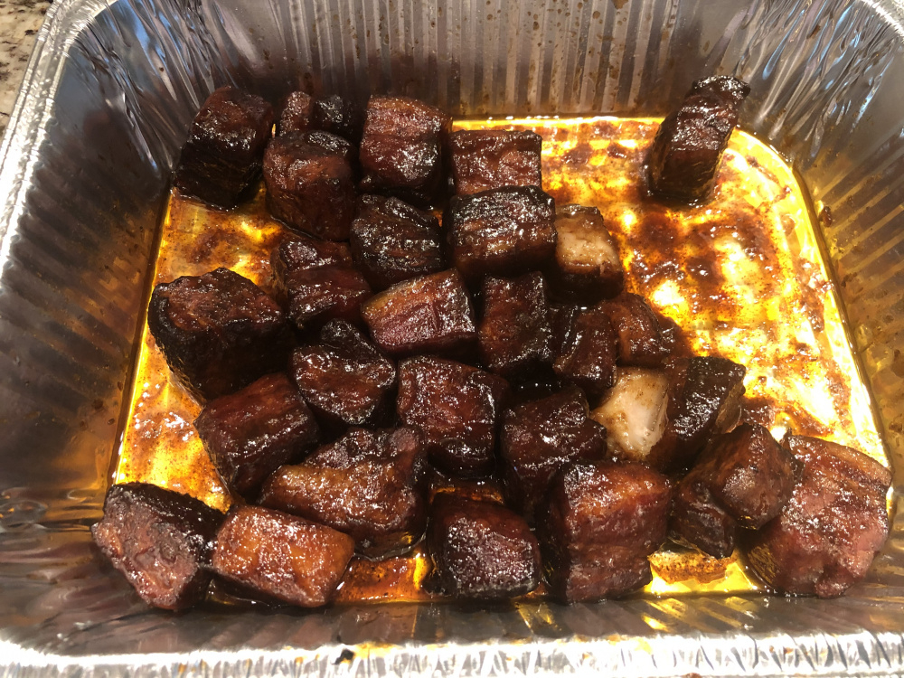 Dusted with Bad Byrons and Killer Hogs AP rub.  On the rack at 260 for 2 hrs then in the foil covered pan with butter, bbq sauce, brown sugar and honey for about an hour braze.  Foil off until glaze set. Good eats!!!