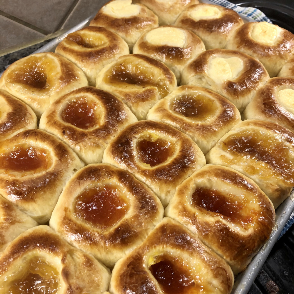 A dollop of lemon pineapple, orange grapefruit orange, or peach habanero bourbon jam in a bunch of them. And some with a cream cheese filling.