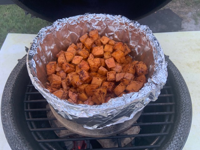 And for the side dish another S...Sweet Potato...a new recipe for us...cut into bite size pieces, mix with melted butter, cinnamon, nutmeg, ginger, salt, brown sugar & I added some DP Pineapple Head...indirect at 350 for an hour...