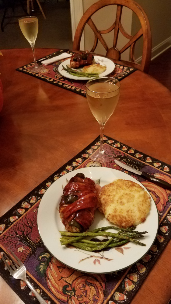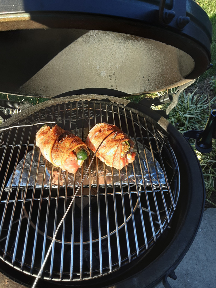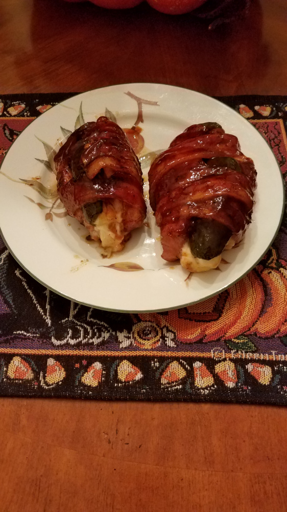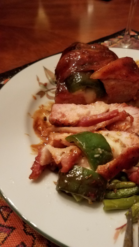 Modified Macom Reed's recipe for bacon wrapped jalapeno chicken thighs. Used 2" thick center cut, boneless pork chops ( on sale at Costco for $1,99/lb) and blue cheese with a pork chop rub. They were delicious.