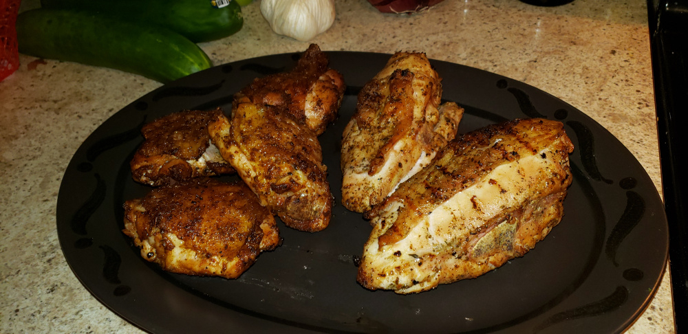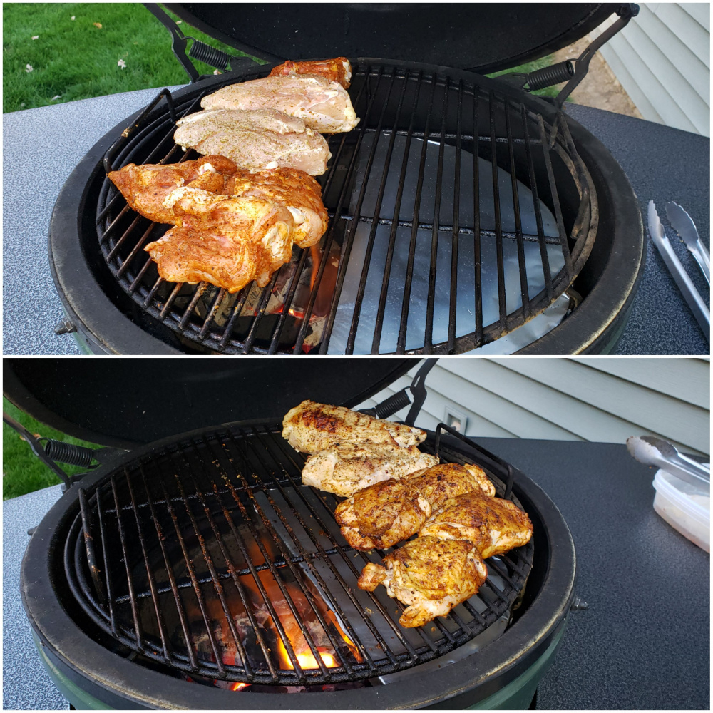 When the egg held 400°, 2 breast and 4 thighs were placed on direct side. Once chard, moved to indirect side.