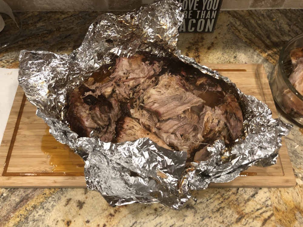 My wife asked me what I wanted for my birthday dinner. I said, "permission to grill all day," so I got a 10.5 lbs. pork butt and started yesterday at 7:30 AM. Hard to capture a favorable picture of pulled pork, but it turned out fantastic. Low-and-slow for 8 hours on the grill, wrapped in foil with 1/2 cup of apple juice, back on the grill for 2 hours, pulled at 195 degrees and added 1/4 cup of maple syrup mixed with 1/4 cup of barbecue sauce and let rest for an hour. Perfect.